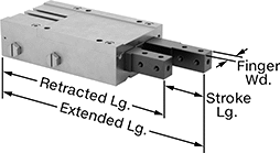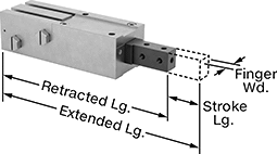 | Stroke | Retracted, mm | Extended, mm | Finger Wd., mm | Jaw Wd., mm | Sensor Ready | Thread Size | Thread Type | Gender | Each | |