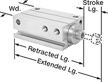 | Stroke | Retracted | Extended | Force @ 100 psi, lbs. | Environmental Rating | Air Cushion Type | Body Material | Thread Size | Thread Type | Gender | Each | |