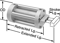 | Stroke | Retracted | Extended | Force @ 100 psi, lbs. | Body Material | Pipe Size | Thread Size | Thread Type | Gender | Each | |