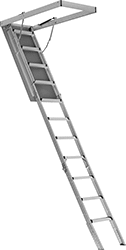 Access overhead spaces. These ladders fold down when you need them and fold up into the ceiling when you don’t. A gas piston reduces the force you need to open and close them. Made from aluminum, these ladders are lightweight and durable. They’re rated Type 1AA, which means they’re tested to hold up to 375 lbs. The ribbed steps have good slip resistance. To reduce energy loss, weatherstripping seals the opening.