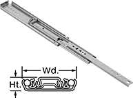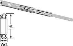 | Closed Lg. | Travel Lg. | For Max. Drawer Wd. | Wd. | Ht. | Capacity per Pair, lbs. | Roller Type | Fasteners Included | Screw Size | Pair | |