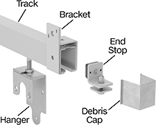 Brackets with a debris cap keep dirt and debris out of the track and roller. They will not prevent the hanger from rolling off the track.