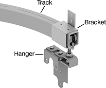 Choose brackets that match the capacity and material of your track. Brackets wrap around the outside of track to mount it in your custom layout. Wall-mount brackets attach directly on any vertical surface. Ceiling-mount brackets mount directly to ceiling joists or hang from a threaded rod. Beam-mount brackets have an edge clamp that attaches to beam flanges.