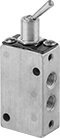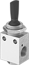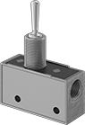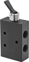 Manually control these valves by pushing or turning the actuator. Also known as 3-way or 3/2 valves, they create one action, such as extending a cylinder. They direct airflow from the inlet to your equipment and exhaust return airflow to create motion. In the off position, they exhaust air pressure from the system, allowing equipment to reset so the action can be repeated. Valves without an exhaust connection exhaust air to the atmosphere.