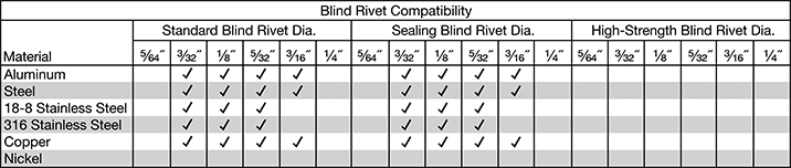 | 3/4" | 1" | 9 1/2" | Four nosepieces (3/32", 1/8", 5/32", and 3/16") 25 aluminum with steel mandrel domed rivets for 0.020”-0.125” thickness (3/16” dia.) 25 steel flush-mount rivets for 0.188”-0.250” thickness (1/8” dia.) 50 aluminum domed rivets for 0.063”-0.125” thickness (1/8” dia.) 50 steel domed rivets for 0.063”-0.125” thickness (1/8” dia.) 50 steel domed rivets for 0.188”-0.250” thickness (1/8” dia.) Plastic Case | 0000000 | 000000 |