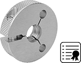 Calibrated in a lab and backed by a certificate traceable to NIST, these gauges check if left-hand threads fall within tolerance. The certificate, sometimes called a test report and long-form certificate, details the tested measurements. Use these gauges on screws, threaded rods, and other parts with external threads. For faster tests, hold more than one ring gauge with a threaded ring gauge holder.