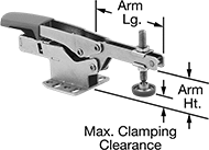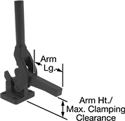 Hold workpieces of different thicknesses with one clamp. These clamps automatically adjust to compensate for variations in size. The handle secures in a horizontal position for more clearance above the clamp than standard hold-down toggle clamps. They have an open arm, so you can move the holding screw to any position along the arm. The holding capacity stays the same regardless of the holding screw's position. The screw has a nonmarring tip.