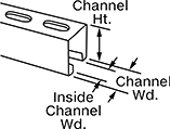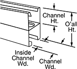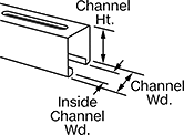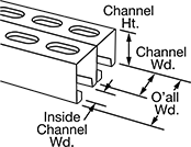 | Material | Ht. | Wd. | Overall Ht. | Thick. | Inside Channel Wd. | 1 ft. | 1 1/2 ft. | 2 ft. | 3 ft. | 4 ft. | 5 ft. | 10 ft. | |