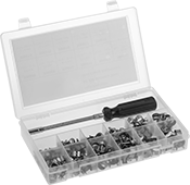 | 5/16" to 3 15/16" | 8 to 100 | 0.031" | -40° to 350° | Firm Hose, Firm Tube, Soft Hose, Soft Tube | SAE J1508 | 155 | Clamps with 3/8" band width, 5/16”-5/8” clamp ID range, SAE No. 2 (20 each) Clamps with 3/8" band width, 1/2"-11/16” clamp ID range, SAE No. 5 (20 each) Clamps with 3/8" band width, 5/8"-7/8” clamp ID range, SAE No. 6 (20 each) Clamps with 3/8" band width, 5/8"-1 1/16" clamp ID range, SAE No. 9 (20 each) Clamps with 3/8" band width, 3/4"-1 1/4" clamp ID range, SAE No. 12 (20 each) Clamps with 3/8" band width, 15/16"-1 3/8" clamp ID range, SAE No. 14 (10 each) Clamps with 3/8" band width, 1"-1 9/16" clamp ID range, SAE No. 17 (10 each) Clamps with 3/8" band width, 1 1/4"-2" clamp ID range, SAE No. 23 (10 each) Clamps with 3/8" band width, 1 9/16"-2 3/8" clamp ID range, SAE No. 30 (5 each) Clamps with 3/8" band width, 2"-2 3/4" clamp ID range, SAE No. 36 (5 each) Clamps with 3/8" band width, 2 3/8"-3 1/8" clamp ID range, SAE No. 42 (5 each) Clamps with 3/8" band width, 2 3/4"-3 9/16" clamp ID range, SAE No. 49 (5 each) Clamps with 3/8" band width, 3 1/8"-3 15/16" clamp ID range, SAE No. 55 (5 each) 9/32" (7 mm) Hex Nutdriver Metal Box | 00000000 | 000000 |