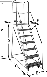| Ht. (A) | Wd. (B) | Dp. (C) | Ht. (D) | Wd. (E) | Dp. (F) | Max. Climbing Ht. | No. of Steps | Cap., lbs. | Ground Clearance Ht. | Color | Wheel Configuration | Specifications Met | Each | No. of Casters | Each | ||