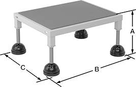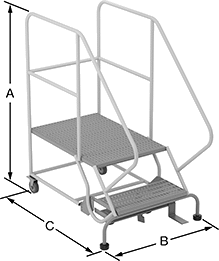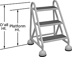 | Style | No. of Steps | Cap., lbs. | Ht.(A) | Wd. (B) | Dp. (C) | Ht. | Wd. | Dp. | Ground Clearance Ht. | Assembled or Unassembled | Wheel Configuration | Specifications Met | Color | Each | No. of Casters | Each | ||