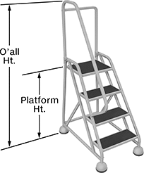 | No. of Steps | Ht. | Wd. | Dp. | Ht. | Wd. | Dp. | Max. Climbing Ht. | Cap., lbs. | Ground Clearance Ht. | Color | Wheel Configuration | With Handrail | Specifications Met | Each | Each | ||