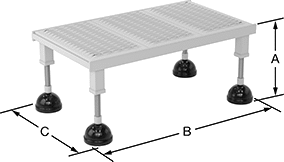 | Max. Platform Ht. | Wd. (B) | Dp. (C) | Wd. | Dp. | Tread | Cap., lbs. | Wt., lbs. | Assembled or Unassembled | Wheel Configuration | Specifications Met | Each | |