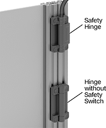 Safety hinges have a switch that automatically shuts off power to machinery when an access door opens. If your door requires more than one hinge, only one needs to have a safety switch; use hinges without a safety switch for the rest. Make sure to mount the safety switch on the rail that won't be moving.