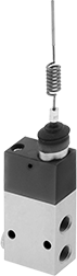 Often used to extend and then retract a cylinder at different speeds, these valves create two actions and have two exhaust ports, which allows you to control the speed of each action by attaching a flow control valve to each exhaust port. A simple automation solution that requires no programming, they activate when an object, such as a box rolling on a conveyor, pushes the actuator. They direct airflow from the inlet to your equipment and exhaust return airflow to create motion. Return actuation is by spring, so they go back to their original position as soon the actuator is released. Also known as 4-way and 5/2 valves.