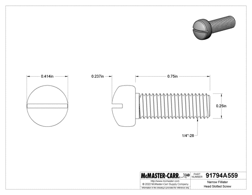 The most corrosion-resistant fillister head slotted screws we offer. With a deeper drive than others, fillister heads reduce the likelihood that basic slotted drivers slip as you hand-tighten them. Since they also have a narrow diameter, they fit into tight spaces, such as holes tucked away inside machinery.