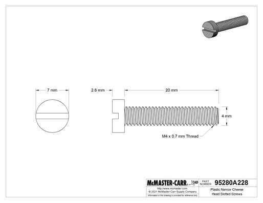 Combine the lightweight and nonconductive properties of plastic with a narrow cheese head that fits into tight spaces. These screws are a good choice to attach panels and covers to electronics and to secure objects in crowded electrical enclosures. With only two contact points, the slotted drive can't withstand much torque, so it's best to hand-tighten them.