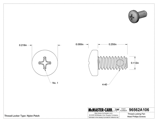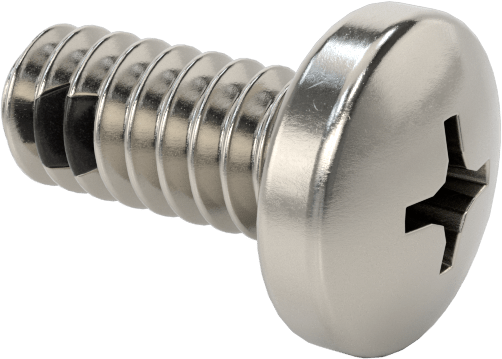 Corrosion and vibration resistant, these pan head screws secure parts in place on machinery with mild vibration. With a nylon-patch threadlocker bonded to the threads, they save you the time and mess of adding it yourself. Pan heads have a moderate height and width profile, offering a middle ground between narrower button heads and wider truss heads. The Phillips drive easily aligns with drivers and withstands more torque than slotted drives, but drivers slip when you apply too much force.