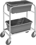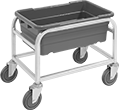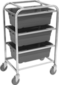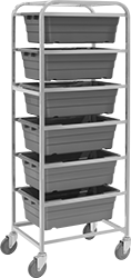 Slide the tote boxes out to access stored materials. When not in use on the cart, the tote boxes nest for compact storage. Carts have a welded aluminum frame and FDA listed plastic tote boxes that can be used in food-service applications. All four casters swivel for easy maneuvering and have abrasion-resistant, nonmarking, and shock-absorbing polyurethane tread-on-core wheels that roll well on rough floors and in areas with debris.