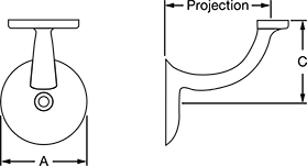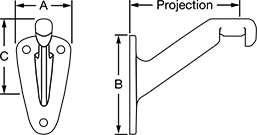 Style | Material | Finish | Appearance | (A) | (B) | (C) | Projection | Thickness | Capacity, lbs. | Mount Type | Mounting Fasteners Included | For Screw Size (No. of Mounting Holes) | Includes | Each | |