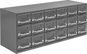 | Total No. of Bins | Wd. | Ht. | Dp. | Capacity, lbs. | Wd. | Ht. | Dp. | Capacity, lbs. | Lock Type | Mounting Fasteners Included | Mounting Hole Dia. (No. of) | Choose a Bin Color | Space Saving Features | Each | Each | ||