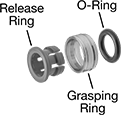 Insert tubing into these fittings and an internal gripping ring and O-ring hold the tubing tight. They are also known as instant fittings. To disconnect, push on the release ring and pull the tubing out of the fitting. Fittings have good corrosion resistance. Use them in low-pressure applications.