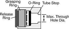 For Tube OD | Material | Material | Color | Max. Pressure | Grasping Ring | O-Ring | Tube Stop | Hole Dia. Tolerance | Max. Through Hole Dia. | Each | |