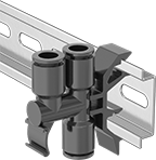 DIN rail connectors clip into a DIN rail to connect and organize your tubing—no tools required. They’re great for running tubing side by side with electrical components. For easy organization, add a label to the slot on these connectors to identify your tubing. They also have a test point that pops out to let you know when your tubing has air in it. After you press it in by hand, it pops out when air is present.