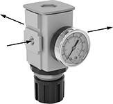 Connect two or more of these manifold regulators to meet multiple pressure requirements from a single air supply—set a different output pressure with each regulator. Use joiner clamps (sold separately) to connect them to other SMC units of the same series, so you can customize your air preparation system. These regulators come with one regulated outlet on their back and one unregulated outlet. All are relieving regulators, so they exhaust when the downstream pressure exceeds the set pressure. Install them in your air line after filters.