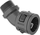 Tabs on one end snap into grooves in conduit; the other end attaches to a knockout in an outlet box or enclosure. These adapters help seal out air and liquid when used with flexible plastic conduit. All meet IP68 for prolonged submersion and IP69K for high-pressure, high-temperature washdowns. They withstand vibration, are flame retardant, and resist oil, solvents, and UV light.