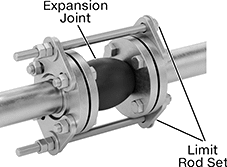 Position the expansion joints as close as possible to anchor points. Attach limit rod sets (sold separately) to the flanges to prevent overextension where anchoring is insufficient. To accommodate the thickness of the limit rod mounting plate, use bolts that are 7/8" longer than the bolts connecting the expansion joint to the pipe flange. Each set of limit rods requires eight bolts (not included).