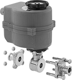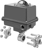 The three-piece bolted body comes apart for access to internal components without unthreading pipe connections and removing the valve from your line. It is 316 stainless steel for excellent corrosion resistance. The actuator is secured to the valve body with a bracket for easy disassembly, maintenance, and repair. A visual flow indicator on the top of the actuator shows whether the valve is open or closed. Two single pole, double throw (SPDT) auxiliary switches allow you to connect these valves to temperature-monitoring equipment, programmable logic controllers, or conveyor sirens. The internal heater automatically turns on when the valve is actuated to prevent motor damage caused by condensation buildup. A manual override allows you to operate the valve during power outages.