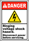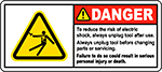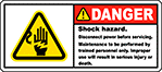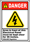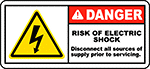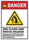 The headers and illustrations on these labels help workers identify electrical hazards at a glance. They meet OSHA 29 CFR 1910.145 safety color standards for indicating hazards.