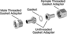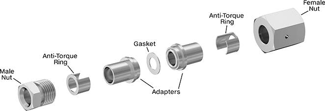 Choose from fully assembled fittings or build a custom fitting. For a complete fitting, you'll need two anti-torque rings, two adapters, a male and female nut, and a gasket.