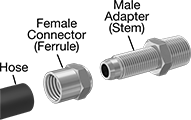 The female connector screws directly onto rubber hose without the need for a separate adapter. You’ll need a female connector (ferrule) and a male adapter (stem) with the same hose ID to make a connection. Screw the female connector onto hose, then thread the male adapter into the female connector. When assembled, the fitting compresses against the hose, forming a strong seal. Also known as reusable fittings, they can be unscrewed from the hose end and used on a new hose.