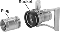A complete coupling consists of a plug and a socket (both sold separately). They’re compatible with MannTek, Avery Hardoll, Todo-matic, and other dry-disconnect couplings that meet NATO standard STANAG 3756.