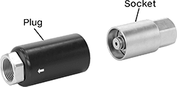 Sockets are push-to-connect style. To connect, push the plug into the socket until you hear a click. To disconnect, slide the sleeve on the socket forward until the plug ejects. These sockets have an internal fluoroelastomer gasket that resists a wide range of chemicals, including benzene, butyl alcohol, and ethylene glycol.