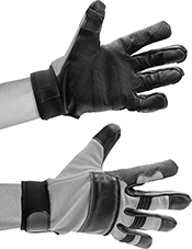 Gloves with grip are textured on one or both sides that provides a secure grip. Full grip gloves are ambidextrous and can be worn on either hand for convenience or to extend use when the grip on one side wears down.