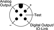 Plug these transmitters into shielded M12 sockets since they're extremely prone to signal interference. These transmitters connect using two wires to send a 4-20mA current output and four wires to use the switching output and IO-link. Connect to pin 5 to utilize the test function to verify that the transmitter's signal processing is working correctly. To view transmitter wiring diagrams, select a part number and click Product Detail.