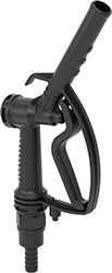 Style B has a trigger to turn flow on and off. It has an angled design, which reduces hose kinking for efficient fueling. Nozzle has a barbed connection; twist hose onto the barbed end and secure with a clamp.