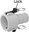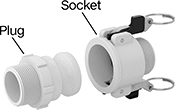 Made of plastic, these couplings are lighter in weight than metal cam-and-groove hose couplings, yet have the chemical resistance to withstand gasoline and other harsh substances. A complete coupling consists of a plug and a socket (both sold separately) that allow you to quickly connect and disconnect medium-to large-diameter hose lines. To connect, insert the plug into the socket and press the levers down. The levers fit snugly into the groove on the plug’s body and force the plug against the gasket to form a tight seal. To disconnect, lift both levers and pull out the plug.