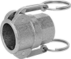 Made of ductile iron, these couplings are tough enough to handle sand, cement, and other abrasive solids and slurries. They resist impact and wear better than aluminum and brass couplings. Use their cam-and-groove fittings to quickly connect and disconnect medium- to large-diameter hose lines. To connect, insert the plug into the socket and press the levers down. The levers fit snugly into the groove on the plug’s body and force the plug against the gasket, forming a tight seal. To disconnect, lift both levers and pull out the plug. A complete coupling consists of a plug and a socket (both sold separately).