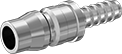 Plugs and sockets with a barbed end insert into plastic or rubber hose and secure with a clamp or a crimp-on hose ferrule.