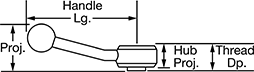 Size | Dp. | Stud Lg. | Handle Lg. | Projection | Hub Projection | Dia. | Material | Color | Stud Material | Insert Material | Temp. Range, °F | Each | |