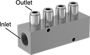 A sealed design prevents contamination in dirty and dusty environments. Use these manifolds to serve multiple lubrication points from a single location. Adjust the flow to individual lubrication points by turning the dial on the corresponding valve. Each valve can be removed for cleaning without disturbing the rest of the system. They can be used with any oil grade. Flow rate depends on temperature. They have NPTF (Dryseal) threads, which are compatible with NPT threads.