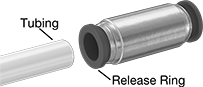 These fittings offer good protection against corrosive environments. Also known as instant fittings, they connect to tubing with a push, and an internal gripping ring and O-ring hold the tubing tight. To disconnect, push on the release ring and pull the tubing out of the fitting.