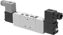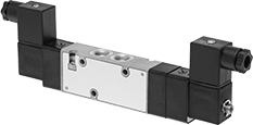 Often used to extend and then retract a cylinder at different speeds, these valves create two actions and have two exhaust ports, which allows you to control the speed of each action by attaching a flow control valve to each exhaust port. Also known as 4-way and 5/2 valves, they actuate when voltage is applied to the electrical connection. They direct airflow from the inlet to your equipment and exhaust return airflow to create motion.