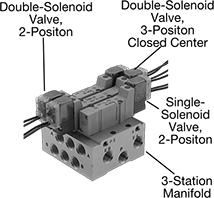 Mount valves to a single-station base or to a manifold, which allows a single pressure source for multiple valves, then add or remove valves as your needs change. Valves with the same style can be used on the same manifold. For example, you can put a Style B, 2-position, spring-return valve and a Style B, 3-position, solenoid-return valve on the same manifold.