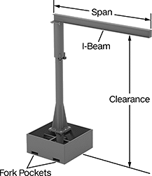 Transport these cranes anywhere they’re needed in your facility. Made with fork pockets in the base, they can be lifted and moved with a fork truck—saving you from taking your load to a mounted crane or having multiple cranes around your building. The first time you use these cranes, fill the base with concrete to keep them stable. Also known as jib cranes, they have an I-beam that rotates 360°, which makes it easy to position loads. The beam can accommodate most trolleys.