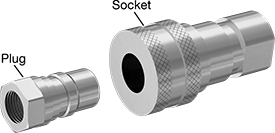 A complete coupling consists of a plug and a socket (both sold separately) that connect and disconnect quickly. Use them if you need frequent access to a hydraulic hose line. All of the International Standard ISO B quick-disconnect plugs are compatible with any of the International Standard ISO B quick-disconnect sockets of the same coupling size, regardless of the pipe size. Couplings meet ISO 7241-1 Series B dimensional and performance standards and are compatible with Parker 60 couplings. Also known as double shut-off couplings, the plugs and sockets both have a shut-off valve that stops the flow when the coupling is separated.